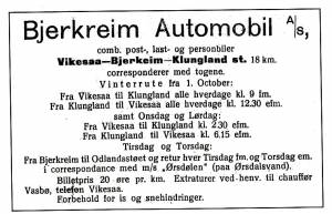 Annonse for ruta Vikeså - Bjerkreim - Klungland. Dalane Tidende 1920