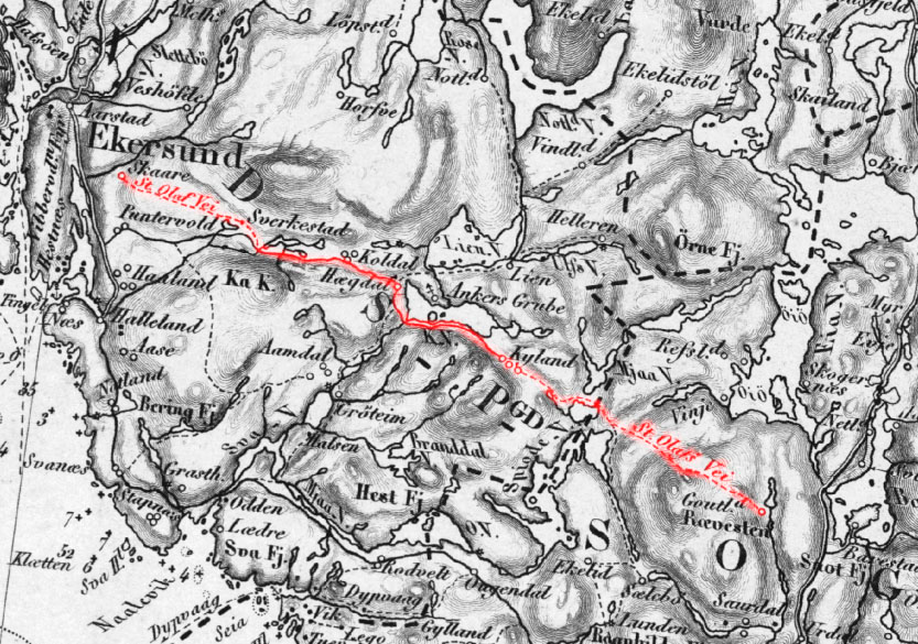Ifølge sagnet seilte Olav den hellige nordfra, da han ved Egersund skulle unngå sine fiender. Han seilte derfor med skuten sin over land og kløyvde berget med kjølen. Han kom etter sagnet seilende inn av sjøen rett på Eigerøy ved Kompåsen, hvor skuta satte nesen høyt i været og dukket så ned og fór tvers over sundet. Så gikk skuta opp Kveldskaret og ned tvers over Årstaddalen, så opp Skårabrekka og til Skåra. Derfra satte han kurs rett sydøst, opp og ned i en rasende fart. På begge sider av dalen kan man ennå se noen store runde hauger, som er størknede bølger etter ferden hans 3).
